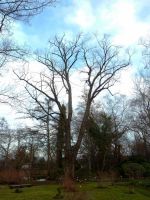 Rot-Eiche mit bereits eingekürzter Krone (li.) und nochmaliger starker Einkürzung um ca. 3m (re.) auf Grund massiver Stammschädigung durch holzzerstörende Pilze